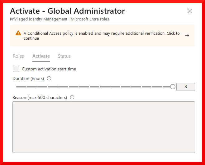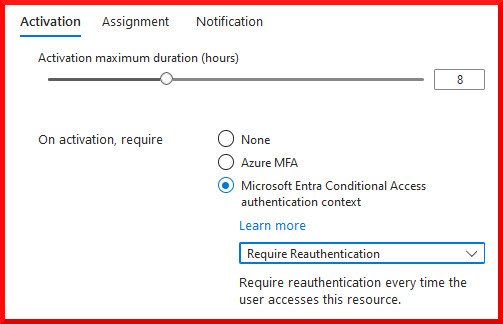 Luckily we can now apply an authentication context requirement in the Entra Role Settings, to ensure that authentication and an MFA challenge occurs every time the role is activated, making it more difficult to use a stolen session for this activity: