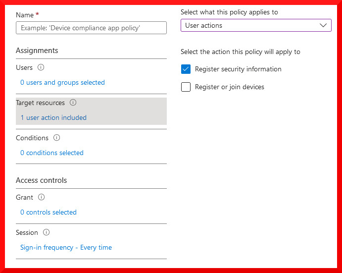 You can find Security Info Registration under the user actions target resource type. If you already have another Conditional Access policy enforcing MFA for all users, this will be triggered by the sign-in frequency control, allowing you to separate your policies if necessary.